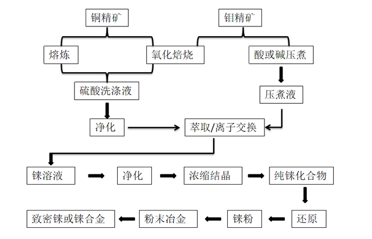 錸是一種含量很低的貴金屬,在自然界中分布很少且不以單獨的礦物存在,大部分錸被發現與鉬共存于銅礦石中,而錸的提取主要來鉬冶煉和銅冶煉的煙灰和廢酸。
